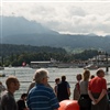 Ueber 500 Besucher haben sich im Lido Luzern eingefunden. Anstatt Sandburgen bauen stehen und staunen die Zuschauer, ob es den Mitglieder der 75 Jahre feiernden SLRG Luzern gelingen wird, das Dampfschiff ans Ziel zu schleppen.