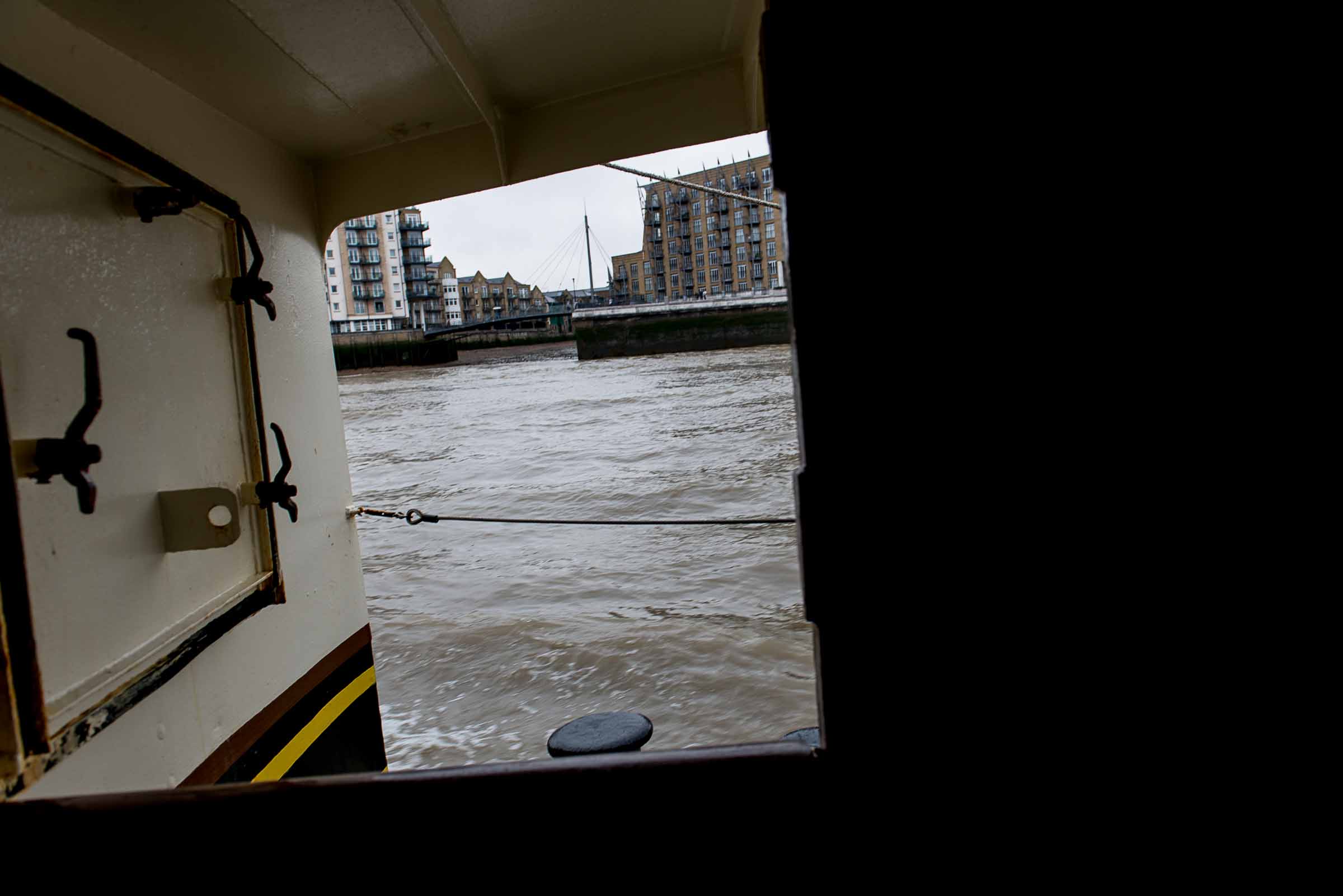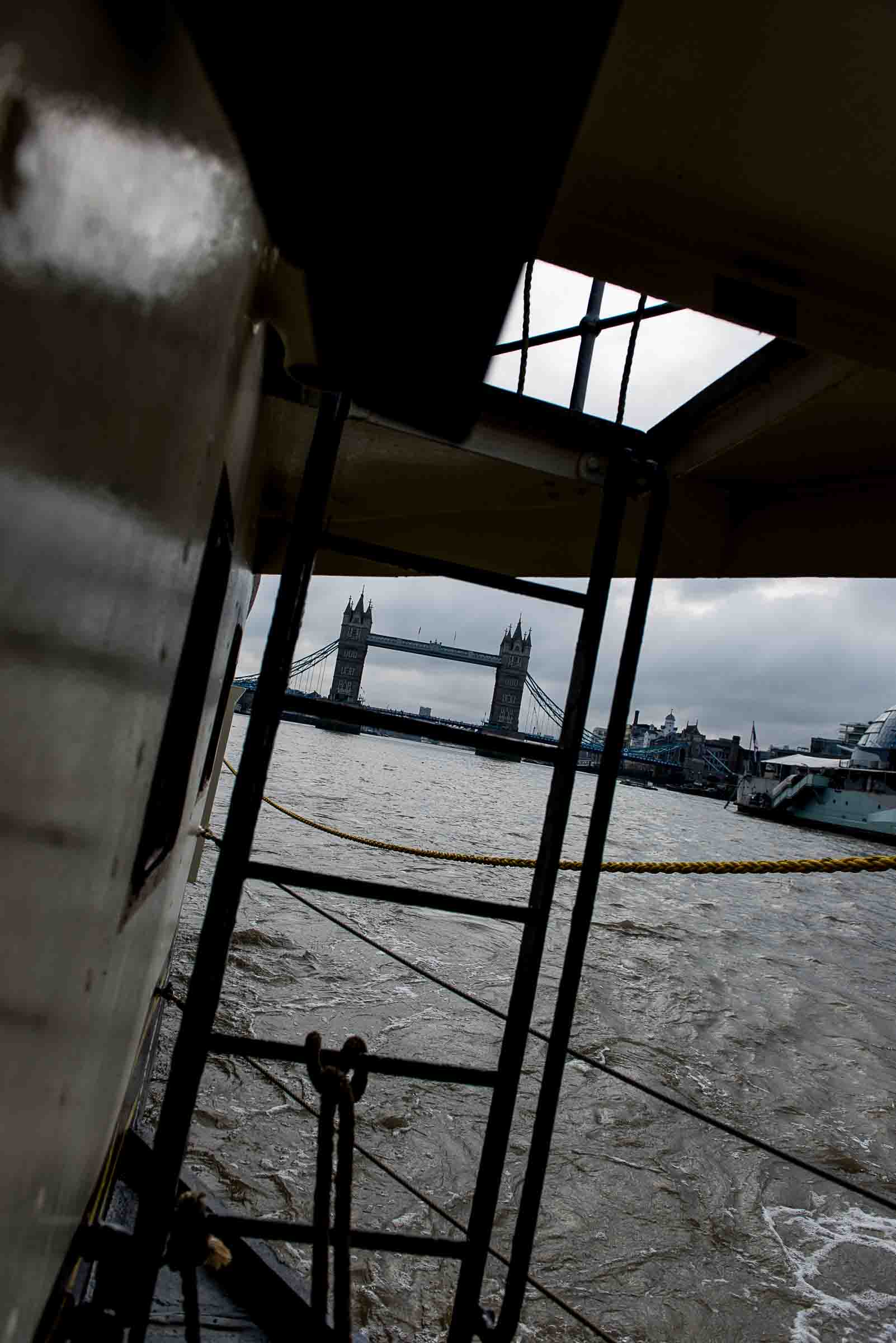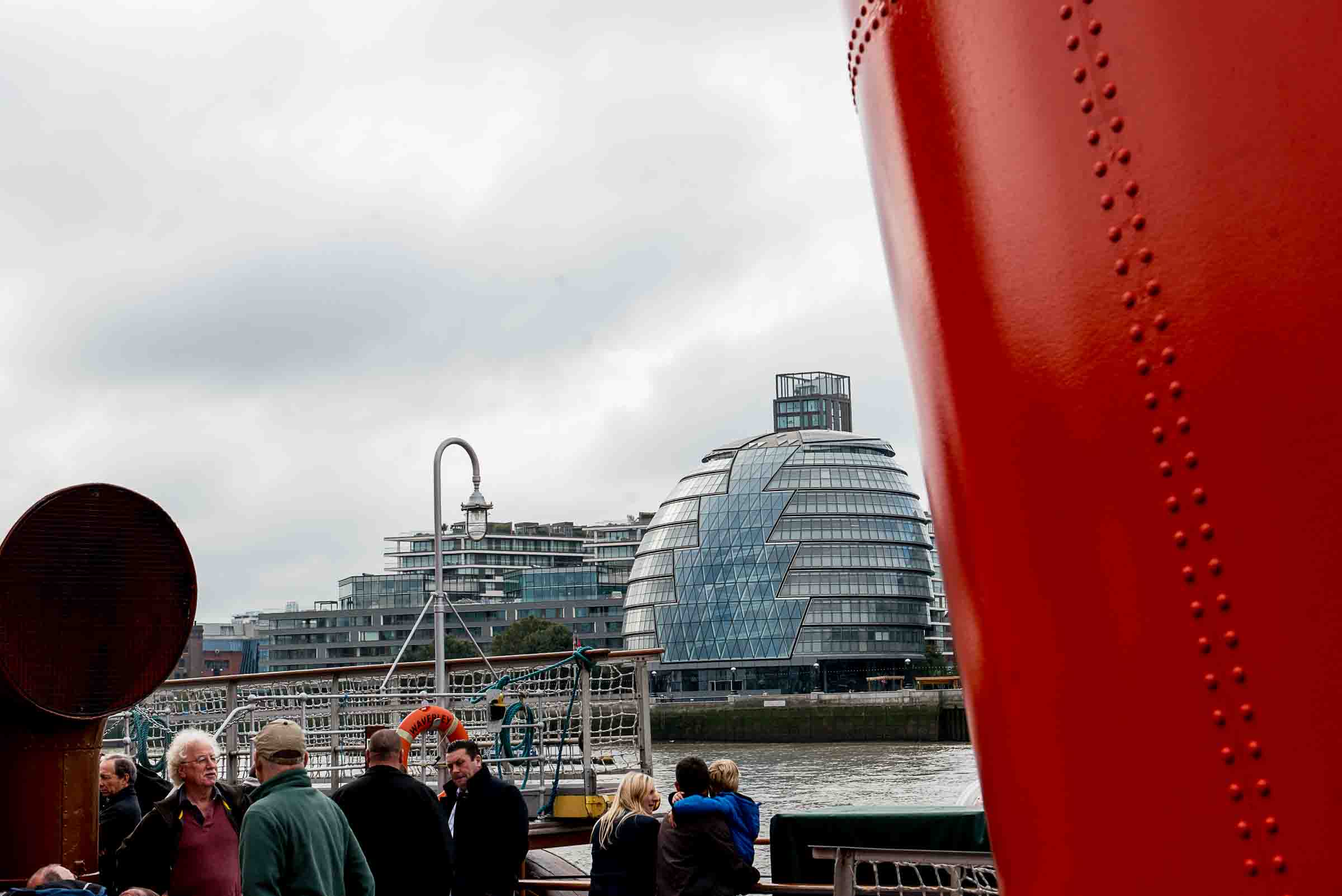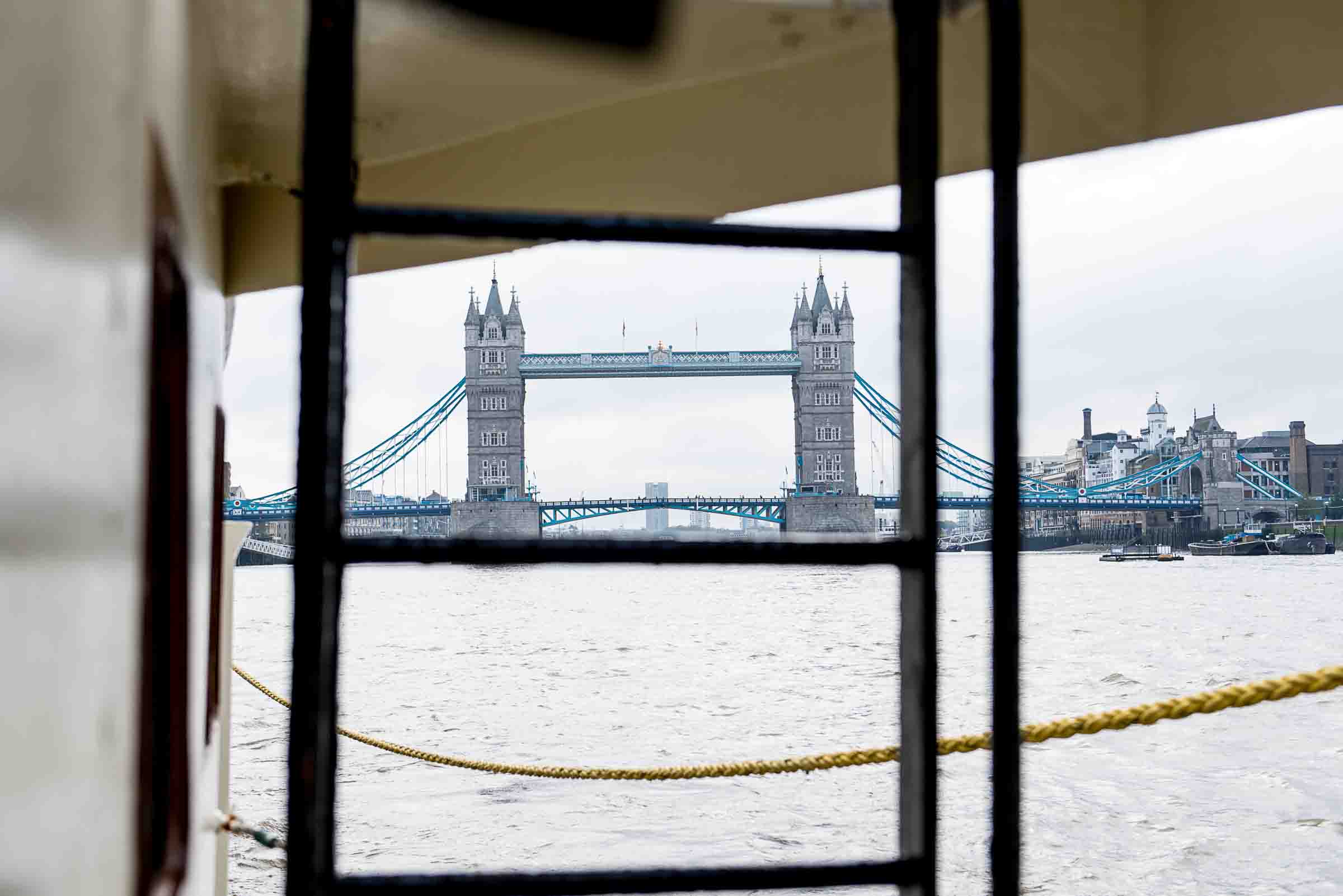 Die Reise beginnt am Tower Pier in London, direkt neben dem imposanten Tower of London. Schon beim Einsteigen spürt man die historische Atmosphäre des Schiffes. Die Waverley, mit ihrem majestätischen Schaufelrad und den eleganten Linien, ist ein wahres Schmuckstück. Trotz des Regens, der sanft auf das Deck prasselt, herrscht eine gemütliche Stimmung. Die Tower Bridge, eines der Wahrzeichen Londons, öffnet sich feierlich, um das Schiff passieren zu lassen. Ein beeindruckender Anblick, der selbst bei grauem Himmel seine Magie entfaltet.