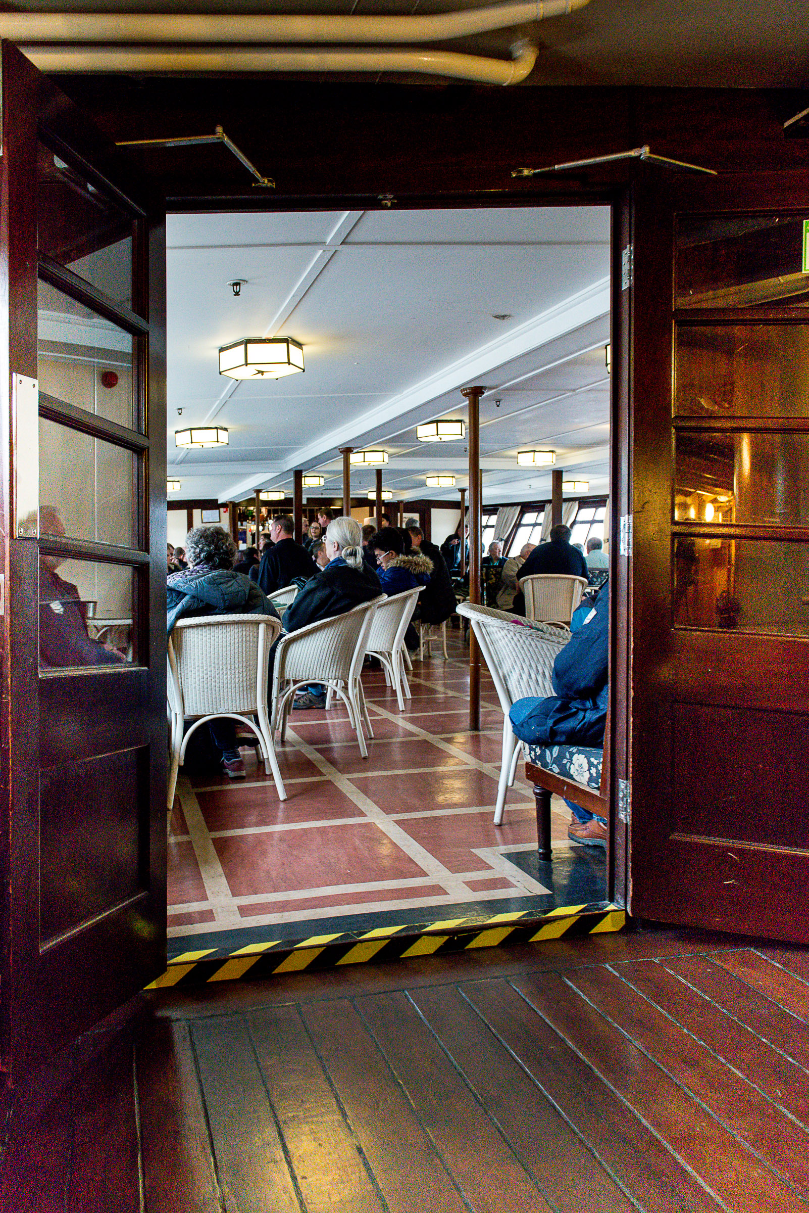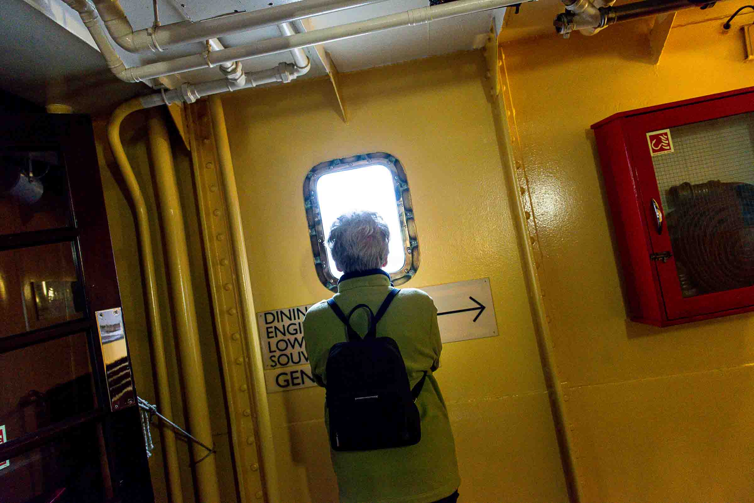 An Bord der Waverley gibt es viel zu entdecken. Das Schiff verfügt über mehrere Decks, die zum Erkunden einladen. Im Inneren des Schiffes findet man gemütliche Salons mit Holztäfelungen und historischen Fotografien, die die Geschichte der Waverley und der Dampfschifffahrt erzählen. Die Fenster bieten trotz des Regens einen wunderbaren Blick auf die vorbeiziehende Landschaft.